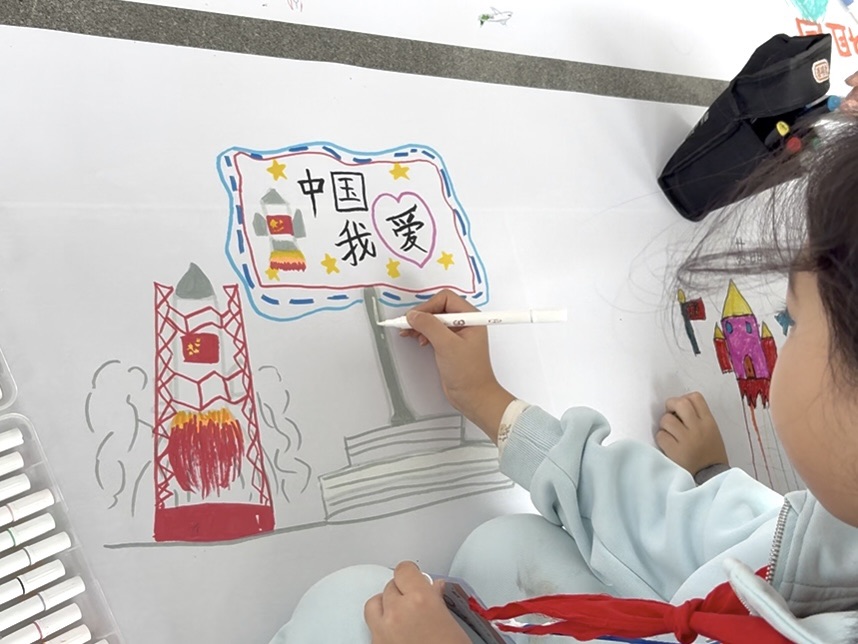 【同期声】宋璐君:我今天画的是火箭,我很敬佩航天员叔叔,我希望祖国的航天事业越来越好!