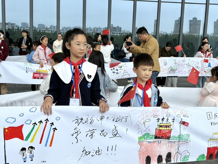 上午9时30分,孩子们手持小红旗陆续签到,现场洋溢着节日的喜庆气氛。活动在《我和我的祖国》的深情合唱中拉开帷幕,小记者与家长们的歌声汇聚成情感的暖流。在了解国庆节的由来与意义后,最令人期待的绘画环节正式开始。